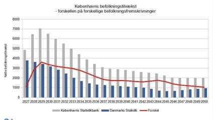 Grafen nedenfor viser FORSKELLEN på Københavns kommunes fantasier om at alle befolkningsbevægelser (i store dele af Danmark) vil ende med at bidrage til en historisk byvækst på størrelse med indbyggertallet i Danmarks tredje største by (Ålborg) i Københavns kommunens Nord-Øst-havn [4] og så Danmarks statistiks seneste befolkningsfremskrivning. Alene frem til 2050 er forskellen på 50.000 FÆRRE indbyggere i København (!)